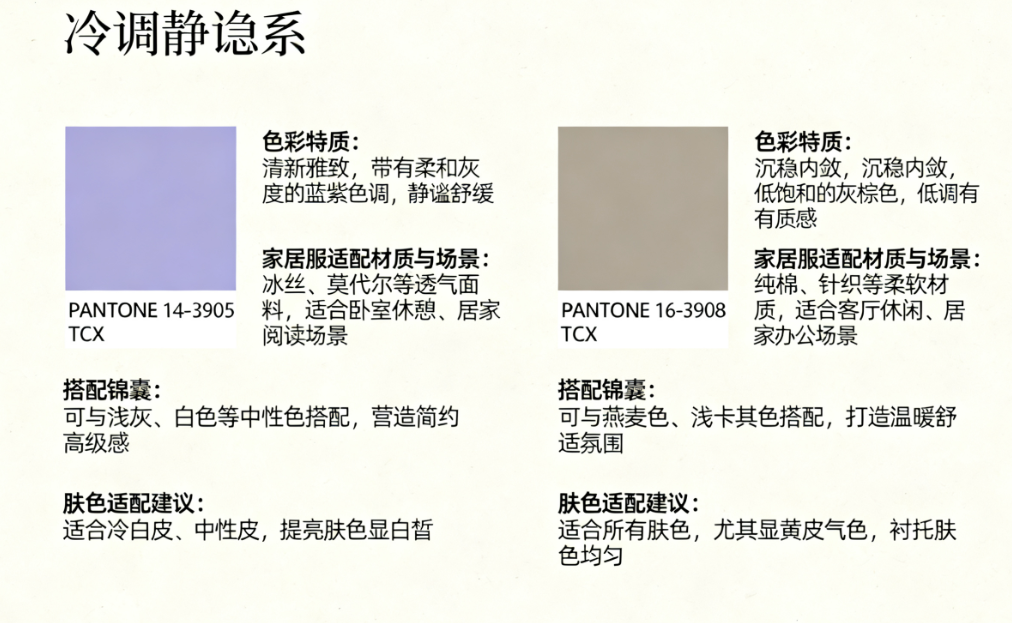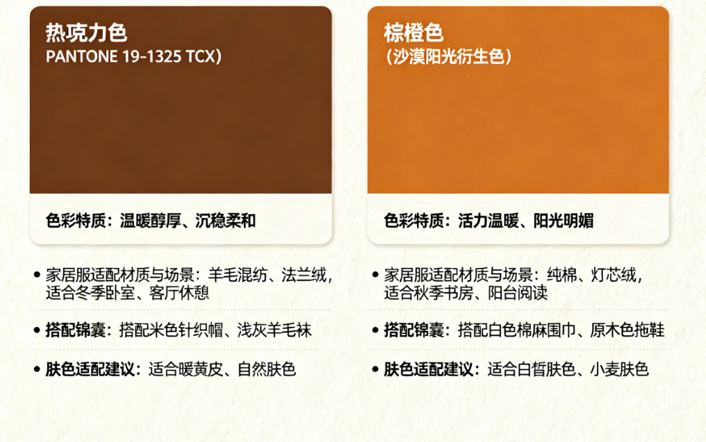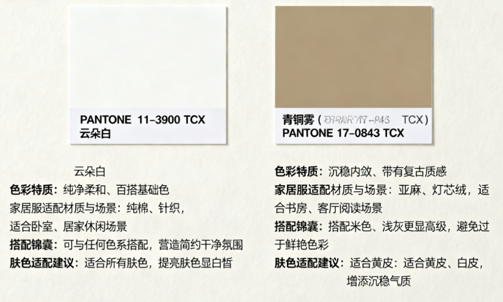 - 青铜雾(PANTONE 17-0843 TCX):带微妙光泽的暖棕色,适配皮质滚边的家居服设计,提升质感又不挑人。
